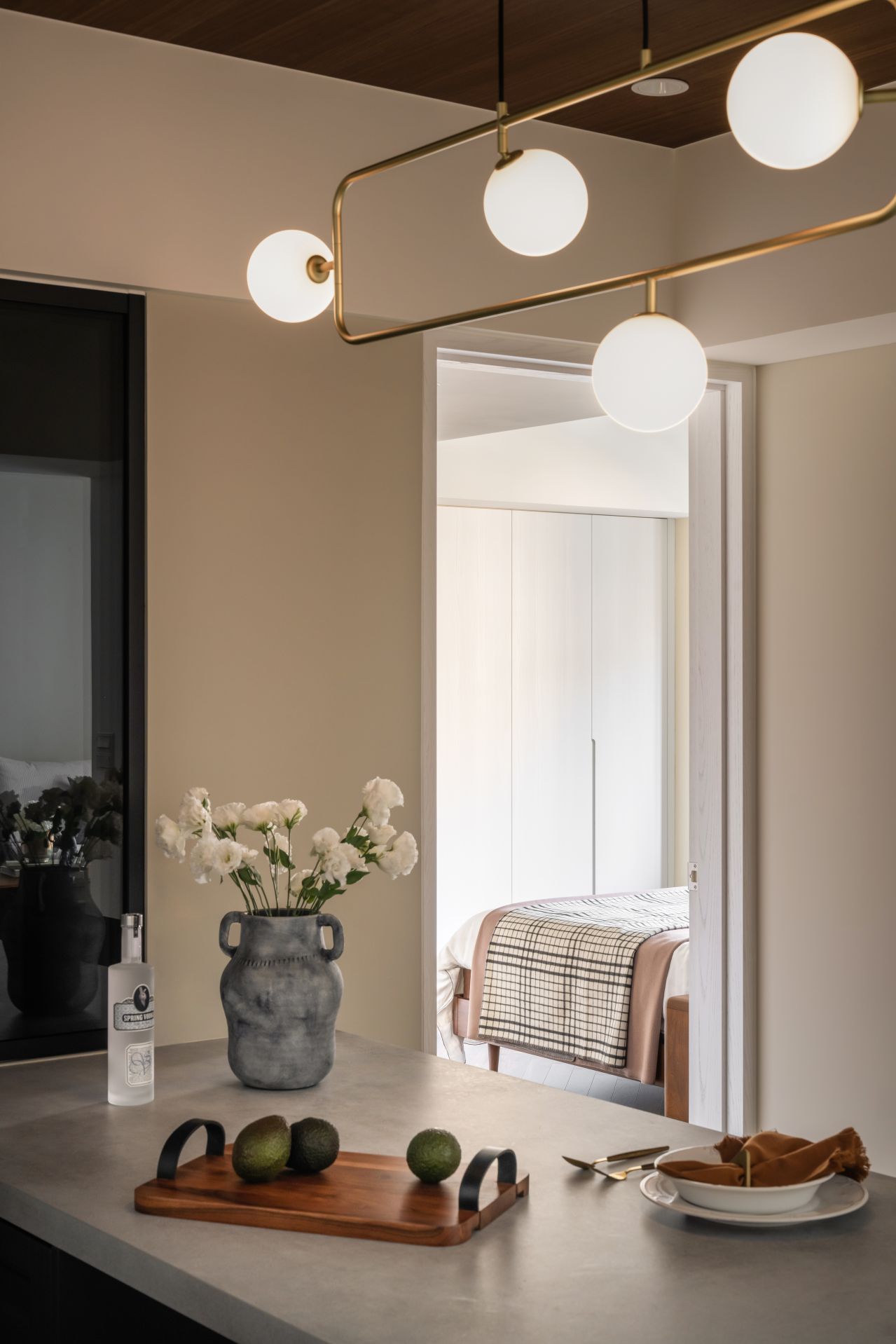 整體設計以黑白及淺木為主調,營造幽寂內斂的低調美感。室內地坪通舖同款淺色地磚,色調連續延展,為僅有十五坪的空間創造視覺放大效果。